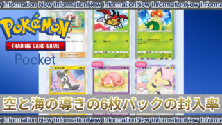 ポケモントレーディングカードゲームポケット(ポケポケ)の「空と海の導き」に6枚パックの封入確率を紹介しています。「ポケポケ空と海の導きの6枚パックはバグ!?」「ポケポケ空と海の導きの6枚パックの確率」