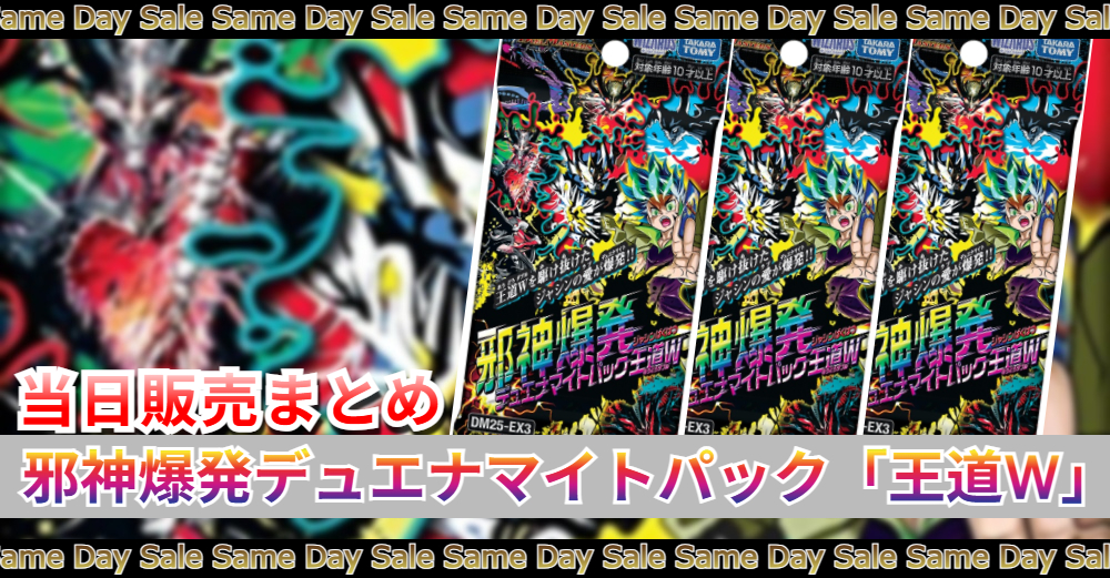 デュエル・マスターズ 邪神爆発デュエナマイトパック「王道W」の当日販売の情報。「邪神爆発デュエナマイトパック 王道Wを売ってるコンビニ」「邪神爆発デュエナマイトパック 王道Wの取扱い店舗」「邪神爆発デュエナマイトパック 王道Wはどこで売ってる!?」
