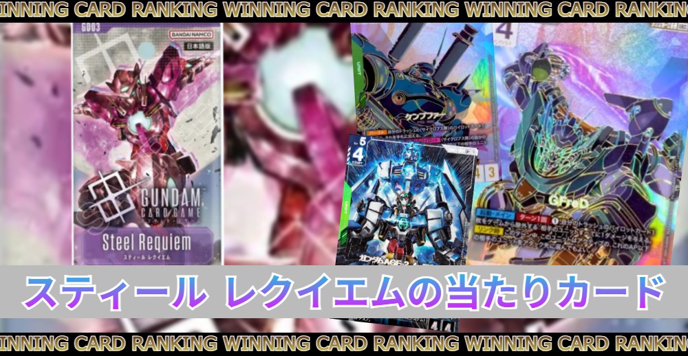 ガンダムカードゲーム Steel Requiem(スティール レクイエム)の当たりカードランキング。「ガンダムカード スティール レクイエムの当たりカード」「ガンダムカード スティール レクイエムの買取価格」「ガンダムカード スティール レクイエムの封入率や封入パターン」