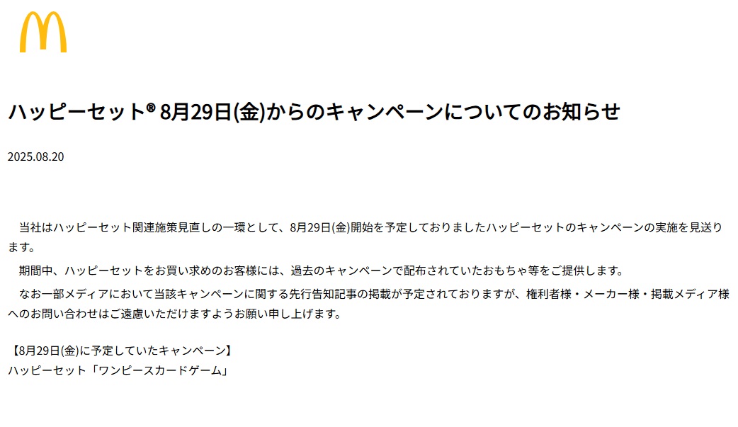 その一環として8月29日から開催予定のマクドナルドとワンピースカードのハッピーセットのキャンペーンの実施を見送ります。