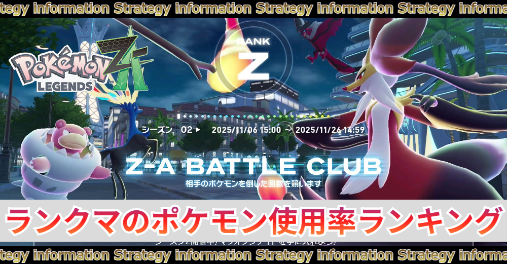 ポケモンZAのランクマッチ シーズン2のポケモン使用率ランキングを掲載しています。「ポケモンZAランクマのおすすめポケモン」「ポケモンZAランクマの使用率ランキング」