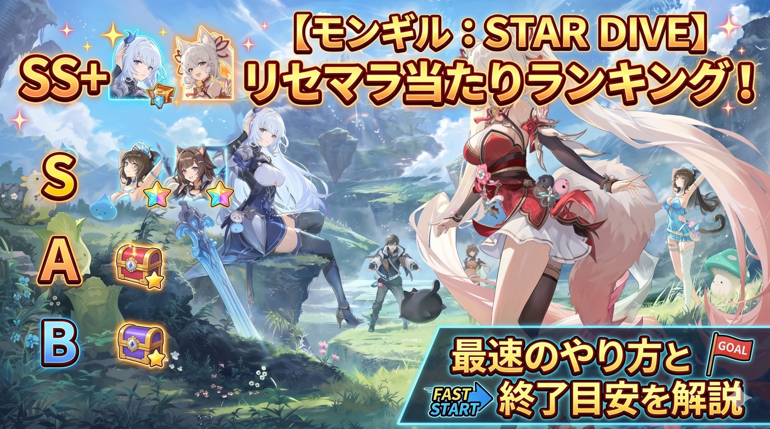 モンギル:STAR DIVEのリセマラ当たりランキングとリセマラのやり方を紹介しています。「モンギル:STAR DIVEのリセマラの必要性「モンギル:STAR DIVEの最速リセマラの方法」