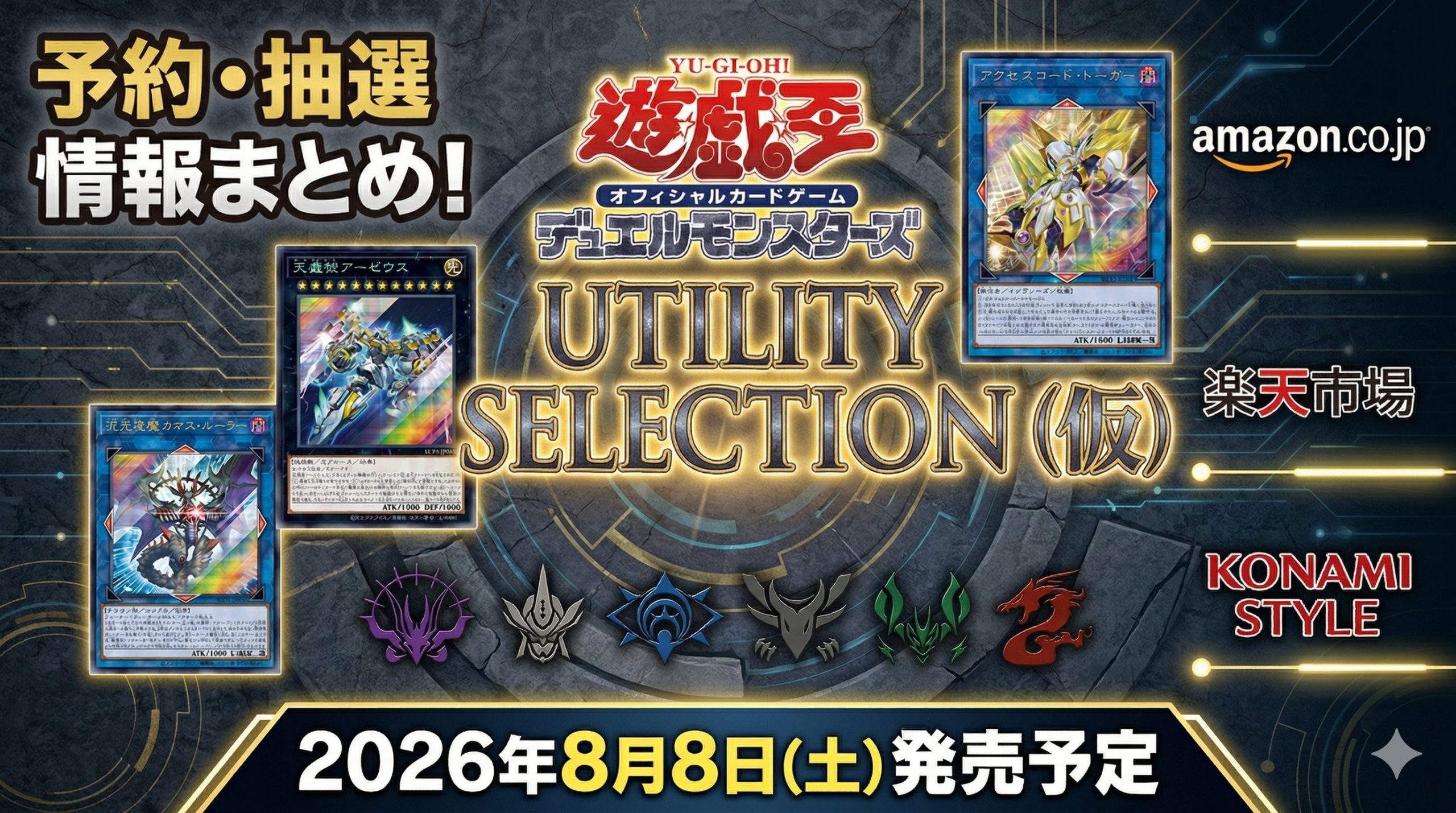 遊戯王OCG UTILITY SELECTION(仮)(ユーティリティ セレクション)の予約・抽選情報をまとめています。 グランドマスターレアの収録も期待されており、非常に高い人気が予想されるため、早めの情報チェックをおすすめします。